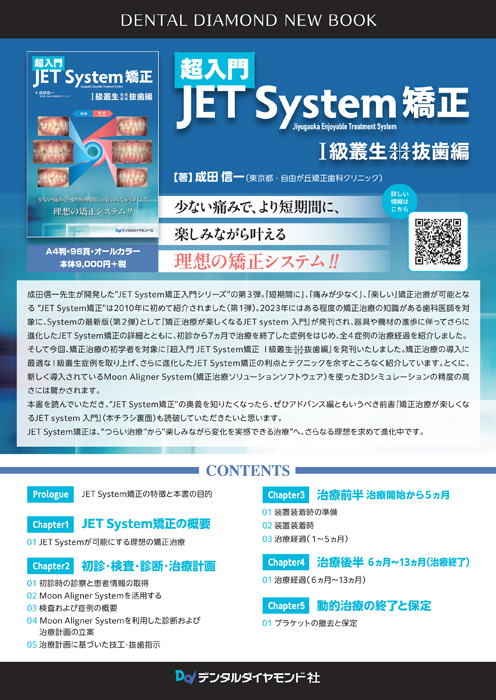 そして今回、矯正治療の初学者を対象に『超入門 JET System矯正 Ⅰ級叢生 抜歯編』を発刊いたしました。矯正治療の導入に最適なⅠ級叢生症例を取り上げ、さらに進化したJET System矯正の利点とテクニックを余すところなく紹介しています。とくに、新しく導入されているMoon Aligner System(矯正治療ソリューションソフトウェア)を使った3Dシミュレーションの精度の高さには驚かされます。
