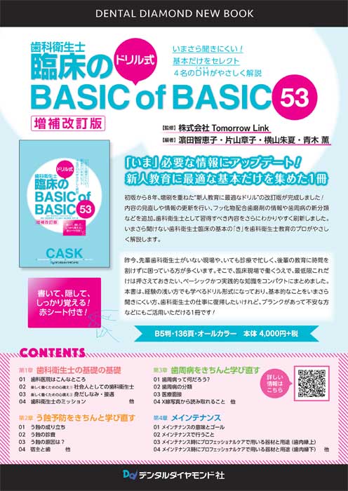昨今、先輩歯科衛生士がいない現場や、いても診療で忙しく、後輩の教育に時間を割けずに困っている方が多くいます。そこで、臨床現場で働くうえで、最低限これだけは押さえておきたい、ベーシックかつ実践的な知識をコンパクトにまとめました。