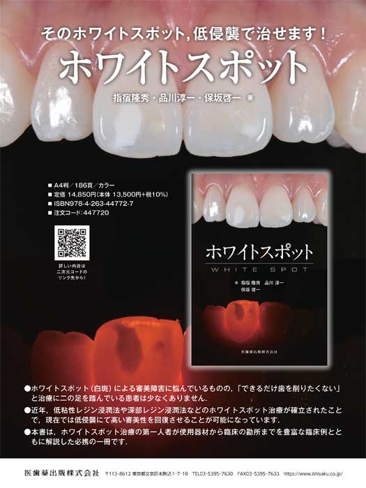 近年,低粘性レジン浸潤法や深部レジン浸潤法などのホワイトスポット治療が確立されたことで,現在では低侵襲にて高い審美性を回復させることが可能になっています.