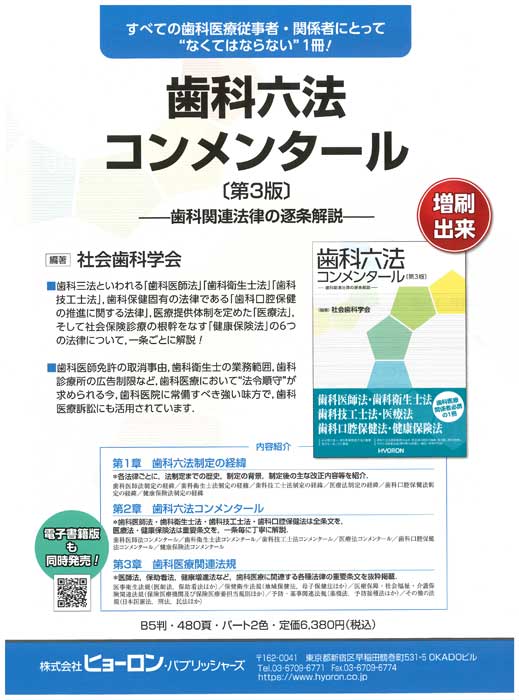 歯科三法といわれる「歯科医師法」「歯科衛生士法」「歯科技工士法」,歯科保健固有の法律である「歯科口腔保健の推進に関する法律」,医療提供体制を定めた「医療法」,そして社会保険診療の根幹をなす「健康保険法」の6つの法律について,最新の法改正に対応し,一条ごとに解説!