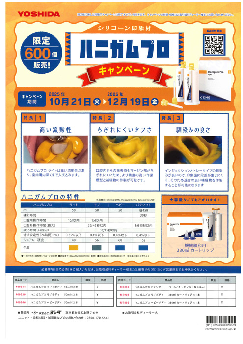 2025. 9/22(月) 〜 10/20(月) i-TFC®システム 光ファイバーポスト® ご愛顧感謝キャンペーン サンメディカル 2025. 9/21(日) 〜 10/20(月) ソールバイト S プラス エクストラハード・ボリュームパック Autumn SALE プレミアムプラスジャパン 2025. 9/22(月) 〜 10/20(月) ティースメイト® ディセンシタイザー ご愛顧感謝キャンペーン クラレノリタケデンタル 2025. 9/22(月) 〜 10/20(月) ティオンオフィス&ティオン ホーム ウィズ スピードホワイトニングキャンペーン ジーシー 2025. 9/22(月) 〜 10/20(月) 器具除菌キャンペーン 佐藤歯材 2025. 8/21(木) 〜 10/20(月) コメット FG ダイヤモンドバー DIAO キャンペーン モモセ歯科商会 2025. 8/21(木) 〜 10/20(月) エンドソリューションキャンペーン ヨシダ 2025. 8/21(木) 〜 10/20(月) 口腔内細菌カウンタ 持ち運びバッグセット キャンペーン ヨシダ 2025. 8/21(木) 〜 10/20(月) 口腔機能モニター Oramo-bfセンサー&カバー 増量キャンペーン ヨシダ 2025. 7/22(火) 〜 10/20(月) Implat studio/Implant studio planner TRIO5® 新規導入サマーキャンペーン モリタ 2025. 7/22(火) 〜 10/20(月) 小器械サマーセール 2025 ヨシダ 2025. 10/1(水) 〜 10/31(金) パラ デンチャーシステム ご愛顧キャンペーン クルツァージャパン 2025. 9/22(月) 〜 11/20(木) JDS抜歯窩掻爬用ダイヤモンドバーキット 新発売記念キャンペーン 日本歯科商社 2025. 9/22(月) 〜 11/20(木) コメット 技工用カーバイドカッター 感謝セール モモセ歯科商会 2025. 9/22(月) 〜 11/20(木) ジェントルスティム・EX 新発売キャンペーン モリタ 2025. 10/1(水) 〜 11/20(木) G-フロー ONE 発売記念 キャンペーン ジーシー 2025. 9/22(月) 〜 11/20(木) NiTi RE ファイル スペシャルプライスキャンペーン ヨシダ 2025. 9/22(月) 〜 11/20(木) ヘムコン デンタル ドレッシング ご愛顧感謝キャンペーン ヨシダ 2025. 10/21(火) 〜 11/28(金) プロエンドご愛顧&規格追加キャンペーン 山八歯材工業 2025. 9/29(月) 〜 11/28(金) スイーツカン ソフト スペシャルキャンペーン ビー・エス・エー・サクライ