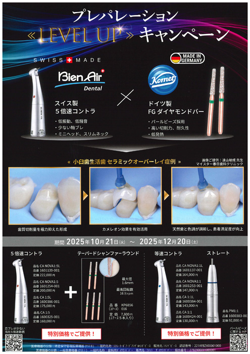2025. 9/22(月) 〜 10/20(月) ティースメイト® ディセンシタイザー ご愛顧感謝キャンペーン クラレノリタケデンタル 2025. 9/22(月) 〜 10/20(月) i-TFC®システム 光ファイバーポスト® ご愛顧感謝キャンペーン サンメディカル 2025. 9/21(日) 〜 10/20(月) ソールバイト S プラス エクストラハード・ボリュームパック Autumn SALE プレミアムプラスジャパン 2025. 9/22(月) 〜 10/20(月) ティオンオフィス&ティオン ホーム ウィズ スピードホワイトニングキャンペーン ジーシー 2025. 9/22(月) 〜 10/20(月) 器具除菌キャンペーン 佐藤歯材 2025. 8/21(木) 〜 10/20(月) コメット FG ダイヤモンドバー DIAO キャンペーン モモセ歯科商会 2025. 8/21(木) 〜 10/20(月) エンドソリューションキャンペーン ヨシダ 2025. 8/21(木) 〜 10/20(月) 口腔内細菌カウンタ 持ち運びバッグセット キャンペーン ヨシダ 2025. 8/21(木) 〜 10/20(月) 口腔機能モニター Oramo-bfセンサー&カバー 増量キャンペーン ヨシダ 2025. 7/22(火) 〜 10/20(月) Implat studio/Implant studio planner TRIO5® 新規導入サマーキャンペーン モリタ 2025. 7/22(火) 〜 10/20(月) 小器械サマーセール 2025 ヨシダ 2025. 10/1(水) 〜 10/31(金) パラ デンチャーシステム ご愛顧キャンペーン クルツァージャパン 2025. 10/21(火) 〜 11/20(木) 基本インスツルメント・関連製品/網トレー リフレッシュキャンペーン YDM 2025. 10/20(月) 〜 11/20(木) クリアフィル® マジェスティ ESフロー ご愛顧感謝キャンペーン クラレノリタケデンタル 2025. 10/21(火) 〜 11/20(木) SA ルーティング® Multi “オートミックス”切り替え応援キャンペーン クラレノリタケデンタル 2025. 10/21(火) 〜 11/20(木) ダンロップホームプロダクツ社 ご愛顧感謝・ご紹介キャンペーン モリタ 2025. 10/21(火) 〜 11/20(木) バルクベース® ハードⅡ 裏層充填キャンペーン サンメディカル 2025. 9/22(月) 〜 11/20(木) JDS抜歯窩掻爬用ダイヤモンドバーキット 新発売記念キャンペーン 日本歯科商社 2025. 9/22(月) 〜 11/20(木) コメット 技工用カーバイドカッター 感謝セール モモセ歯科商会 2025. 9/22(月) 〜 11/20(木) ジェントルスティム・EX 新発売キャンペーン モリタ