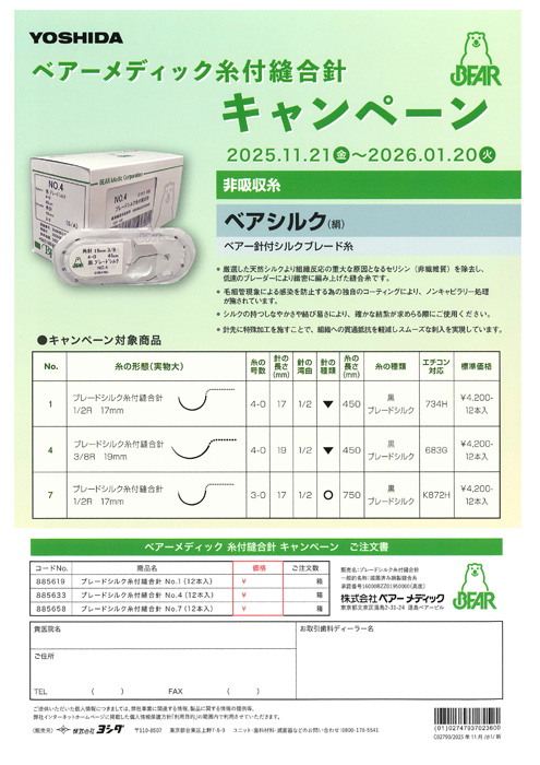 このたび、「ベアーメディック糸付縫合針 キャンペーン」を実施いたします。 期間中、対象のブレードシルク糸付縫合針をキャンペーン価格にてご提供いたします。 ぜひ、この機会をご利用ください。