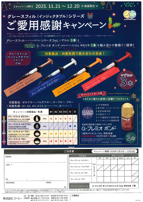 2025. 10/21(火) 〜 11/20(木) 基本インスツルメント・関連製品/網トレー リフレッシュキャンペーン YDM 2025. 10/21(火) 〜 11/20(木) クリアフィル® マジェスティ ESフロー ご愛顧感謝キャンペーン クラレノリタケデンタル 2025. 10/21(火) 〜 11/20(木) SA ルーティング® Multi “オートミックス”切り替え応援キャンペーン クラレノリタケデンタル 2025. 10/21(火) 〜 11/20(木) ダンロップホームプロダクツ社 ご愛顧感謝・ご紹介キャンペーン モリタ 2025. 10/21(火) 〜 11/20(木) バルクベース® ハードⅡ 裏層充填キャンペーン サンメディカル 2025. 9/22(月) 〜 11/20(木) JDS抜歯窩掻爬用ダイヤモンドバーキット 新発売記念キャンペーン 日本歯科商社 2025. 9/22(月) 〜 11/20(木) コメット 技工用カーバイドカッター 感謝セール モモセ歯科商会 2025. 9/22(月) 〜 11/20(木) ジェントルスティム・EX 新発売キャンペーン モリタ 2025. 10/1(水) 〜 11/20(木) G-フロー ONE 発売記念 キャンペーン ジーシー 2025. 9/22(月) 〜 11/20(木) NiTi RE ファイル スペシャルプライスキャンペーン ヨシダ 2025. 9/22(月) 〜 11/20(木) ヘムコン デンタル ドレッシング ご愛顧感謝キャンペーン ヨシダ 2025. 10/21(火) 〜 11/28(金) プロエンドご愛顧&規格追加キャンペーン 山八歯材工業 2025. 9/29(月) 〜 11/28(金) スイーツカン ソフト スペシャルキャンペーン ビー・エス・エー・サクライ 2025. 10/1(水) 〜 11/28(金) OKABE 大決算SALE 岡部 2025. 10/21(火) 〜 12/9(火) マルチセラミック・グラインダーHP ETNA キャンペーン モモセ歯科商会 2025. 11/21(金) 〜 12/19(金) 表面の除菌清掃 表面除菌キャンペーン 佐藤歯材 2025. 10/21(火) 〜 12/19(金) TCPクリニカル/テクニカル4本セットキャンペーン&サンポリッシャーキャンペーン 白水貿易 2025. 10/21(火) 〜 12/19(金) DHサポート ウィンターキャンペーン YDM 2025. 10/21(火) 〜 12/19(金) インプラントツール 特別セットキャンペーン モモセ歯科商会 2025. 10/21(火) 〜 12/19(金) アンジェラスホーム キャンペーン ヨシダ