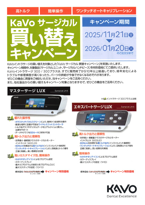 KaVoイントラサージの買い替えを対象とした「KaVo サージカル 買替キャンペーン」を実施いたします。