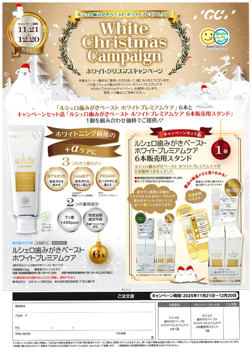2025. 10/21(火) 〜 11/20(木) 基本インスツルメント・関連製品/網トレー リフレッシュキャンペーン YDM 2025. 10/21(火) 〜 11/20(木) クリアフィル® マジェスティ ESフロー ご愛顧感謝キャンペーン クラレノリタケデンタル 2025. 10/21(火) 〜 11/20(木) SA ルーティング® Multi “オートミックス”切り替え応援キャンペーン クラレノリタケデンタル 2025. 10/21(火) 〜 11/20(木) ダンロップホームプロダクツ社 ご愛顧感謝・ご紹介キャンペーン モリタ 2025. 10/21(火) 〜 11/20(木) バルクベース® ハードⅡ 裏層充填キャンペーン サンメディカル 2025. 9/22(月) 〜 11/20(木) JDS抜歯窩掻爬用ダイヤモンドバーキット 新発売記念キャンペーン 日本歯科商社 2025. 9/22(月) 〜 11/20(木) コメット 技工用カーバイドカッター 感謝セール モモセ歯科商会 2025. 9/22(月) 〜 11/20(木) ジェントルスティム・EX 新発売キャンペーン モリタ 2025. 10/1(水) 〜 11/20(木) G-フロー ONE 発売記念 キャンペーン ジーシー 2025. 9/22(月) 〜 11/20(木) NiTi RE ファイル スペシャルプライスキャンペーン ヨシダ 2025. 9/22(月) 〜 11/20(木) ヘムコン デンタル ドレッシング ご愛顧感謝キャンペーン ヨシダ 2025. 10/21(火) 〜 11/28(金) プロエンドご愛顧&規格追加キャンペーン 山八歯材工業 2025. 9/29(月) 〜 11/28(金) スイーツカン ソフト スペシャルキャンペーン ビー・エス・エー・サクライ 2025. 10/1(水) 〜 11/28(金) OKABE 大決算SALE 岡部 2025. 10/21(火) 〜 12/9(火) マルチセラミック・グラインダーHP ETNA キャンペーン モモセ歯科商会 2025. 11/21(金) 〜 12/19(金) 表面の除菌清掃 表面除菌キャンペーン 佐藤歯材 2025. 10/21(火) 〜 12/19(金) TCPクリニカル/テクニカル4本セットキャンペーン&サンポリッシャーキャンペーン 白水貿易 2025. 10/21(火) 〜 12/19(金) DHサポート ウィンターキャンペーン YDM 2025. 10/21(火) 〜 12/19(金) インプラントツール 特別セットキャンペーン モモセ歯科商会 2025. 10/21(火) 〜 12/19(金) アンジェラスホーム キャンペーン ヨシダ