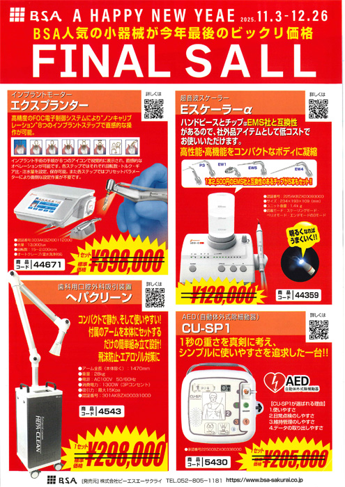 2025. 10/21(火) 〜 11/20(木) 基本インスツルメント・関連製品/網トレー リフレッシュキャンペーン YDM 2025. 10/21(火) 〜 11/20(木) クリアフィル® マジェスティ ESフロー ご愛顧感謝キャンペーン クラレノリタケデンタル 2025. 10/21(火) 〜 11/20(木) SA ルーティング® Multi “オートミックス”切り替え応援キャンペーン クラレノリタケデンタル 2025. 10/21(火) 〜 11/20(木) ダンロップホームプロダクツ社 ご愛顧感謝・ご紹介キャンペーン モリタ 2025. 10/21(火) 〜 11/20(木) バルクベース® ハードⅡ 裏層充填キャンペーン サンメディカル 2025. 9/22(月) 〜 11/20(木) JDS抜歯窩掻爬用ダイヤモンドバーキット 新発売記念キャンペーン 日本歯科商社 2025. 9/22(月) 〜 11/20(木) コメット 技工用カーバイドカッター 感謝セール モモセ歯科商会 2025. 9/22(月) 〜 11/20(木) Dr.JAW インテンシブクリーム 新発売キャンペーン 日本歯科商社 2025. 9/22(月) 〜 11/20(木) PLUM-PINK lIP SHOT キャンペーン 日本歯科商社 2025. 9/22(月) 〜 11/20(木) ジェントルスティム・EX 新発売キャンペーン モリタ 2025. 10/1(水) 〜 11/20(木) G-フロー ONE 発売記念 キャンペーン ジーシー 2025. 9/22(月) 〜 11/20(木) NiTi RE ファイル スペシャルプライスキャンペーン ヨシダ 2025. 9/22(月) 〜 11/20(木) ヘムコン デンタル ドレッシング ご愛顧感謝キャンペーン ヨシダ 2025. 10/21(火) 〜 11/28(金) プロエンドご愛顧&規格追加キャンペーン 山八歯材工業 2025. 9/29(月) 〜 11/28(金) スイーツカン ソフト スペシャルキャンペーン ビー・エス・エー・サクライ 2025. 10/1(水) 〜 11/28(金) OKABE 大決算SALE 岡部 2025. 10/21(火) 〜 12/9(火) マルチセラミック・グラインダーHP ETNA キャンペーン モモセ歯科商会 2025. 9/30(火) 〜 12/10(水) キシリトール スイーツまつり ビー・エス・エー・サクライ 2025. 11/21(金) 〜 12/19(金) 表面の除菌清掃 表面除菌キャンペーン 佐藤歯材 2025. 10/21(火) 〜 12/19(金) TCPクリニカル/テクニカル4本セットキャンペーン&サンポリッシャーキャンペーン 白水貿易