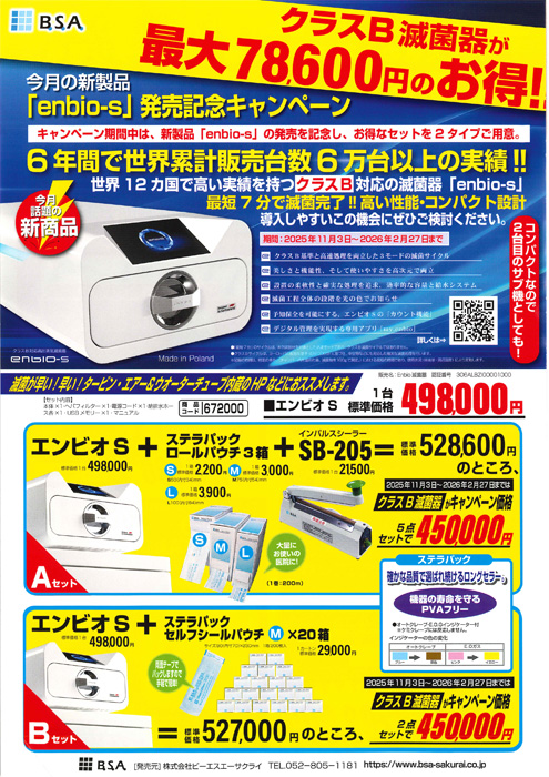 このたび、「クラスBコンパクト滅菌器「enbio-s」新発売キャンペーン」を実施いたします。