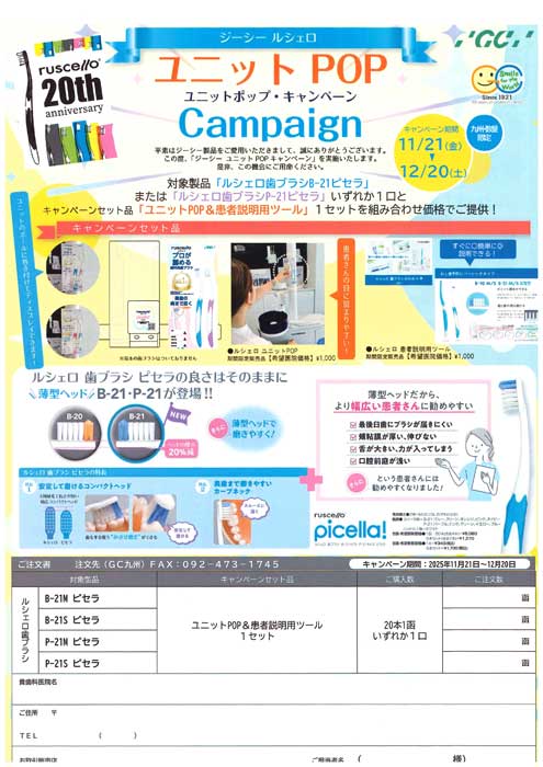 2025. 11/4(火) 〜 11/28(金) ルミデント オータムキャンペーン クルツァージャパン 2025. 11/1(土) 〜 11/30(日) 魔法の舌ブラシ キャンペーン トータルサポートOTA 2025. 11/21(金) 〜 12/19(金) LION 2025プレミアムグッズセール vol.6 ライオン歯科材 2025. 11/21(金) 〜 12/19(金) ソニッケアー 替ブラシ5+1キャンペーン モリタ 2025. 10/21(火) 〜 12/19(金) フロー・サイナスケア ウィンターキャンペーン モリタ 2025. 10/21(火) 〜 12/19(金) クラプロックス ハイドロソニック プロ トライアルキャンペーン ヨシダ 2025. 11/21(金) 〜 12/20(土) ルシェロ おとなのトータルケア歯みがきジェル Re:Fresh キャンペーン ジーシー 2025. 11/21(金) 〜 12/20(土) ホイップクレンズ990mL 発売記念 冬のすっきり洗浄 キャンペーン ジーシー 2025. 10/21(火) 〜 12/20(土) ルシェロ おとなのトータルケアはみがきジェル Re:Fresh キャンペーン ジーシー 2025. 10/21(火) 〜 12/25(木) サム ウインターセール サンデンタル 2025. 10/24(金) 〜 2026. 1/9(金) タフト24・17・20 クリスマス&お正月 スペシャルパッケージ キャンペーン オーラルケア 2025. 11/4(火) 〜 2026. 1/15(木) フィリップス ソニッケア― 電動歯ブラシ・口腔洗浄器を使ってみよう!キャッシュバックキャンペーン モリタ 2025. 11/21(金) 〜 2026. 1/20(火) ビフィズス菌末 BB536 キャンペーン ヨシダ 2025. 9/21(日) 〜 2026. 1/20(火) クラプロックス BIW 日向小次郎デザインキャンペーン ヨシダ 2025. 9/22(月) 〜 2026. 1/20(火) クラプロックス BE YOU トラベルセット キャンペーン ヨシダ 2025. 9/22(月) 〜 2026. 1/20(火) ハイドロソニックイージー センシティブ替えブラシ キャンペーン ヨシダ 2025. 9/22(月) 〜 2026. 1/20(火) ハイドロソニック カラー替えブラシ まとめ買いキャンペーン ヨシダ 2025. 8/21(木) 〜 2026. 1/20(火) クラプロックス 歯ブラシ選べるキャンペーン ヨシダ