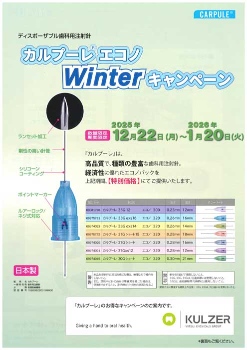 このたび、「カルプーレ エコノ ウィンターキャンペーン」を実施致します。 高品質で、種類の豊富な歯科用注射針です。 経済性に優れたエコノパックを期間中、特別価格にてご提供いたします。 ぜひ、この機会をご利用ください。