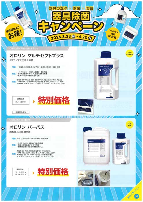 2026. 2/10(火) 〜 3/18(水) エンゼル スキャンスプレー キャンペーン 大榮歯科産業 2026. 2/24(火) 〜 3/18(水) 大榮歯科産業 スーパーセール 大榮歯科産業 2026. 2/24(火) 〜 3/19(木) マニー スプリングキャンペーン マニー 2026. 2/24(火) 〜 3/19(木) i-TFC® システム 光ファイバーポスト™ ご愛顧感謝キャンペーン サンメディカル 2026. 2/24(火) 〜 3/19(木) エデンタ CR研磨バー キャンペーン モリタ 2026. 2/24(火) 〜 3/19(木) シロプロ 3rd Generation、トリオパック及びオプション製品 スプリングキャンペーン ビエン・エア・アジア 2026. 2/24(火) 〜 3/19(木) シロプロ PLUS 3rd Gen.外科用ユニット トリオパック及びオプション製品 スプリングキャンペーン ビエン・エア・アジア 2026. 1/24(土) 〜 3/19(木) フルジルコニアクラウン 審美性UPキャンペーン モリタ 2026. 2/24(火) 〜 3/19(木) LION スプリングセール 2026 vol.1 モリタ 2026. 2/24(火) 〜 3/19(木) サンメディカル バルクベース® ハードⅡ 裏層充填キャンペーン サンメディカル 2026. 2/24(火) 〜 3/19(木) クリアフィル® マジェスティ® ESフロー 【High】【Low】【Super Low】ご愛顧感謝キャンペーン クラレノリタケデンタル 2026. 2/24(火) 〜 3/19(木) SA ルーティング® Multi “オートミックス”販売促進キャンペーン クラレノリタケデンタル 2026. 2/24(火) 〜 3/19(木) SKメディカル電子技工製品・診療製品小器械 ウィンターキャンペーン【診療編】 モリタ 2026. 2/24(火) 〜 3/19(木) マウスガード除菌・洗浄スプレーEX ご愛顧感謝キャンペーン モリタ 2026. 2/24(火) 〜 3/19(木) チェアサイド製品キャンペーン YAMAKIN 2026. 2/24(火) 〜 3/19(木) ヌールコート キャンペーン YAMAKIN 2026. 2/24(火) 〜 3/19(木) HyFlex™ EDM キャンペーン コルテンジャパン 2026. 1/21(水) 〜 3/19(木) サクッと削れる!リムーバルバー3シリーズ 特別価格キャンペーン モモセ歯科商会 2026. 1/19(月) 〜 3/19(木) 「i-TFC® ルミナスⅡ」シリーズ 販売一周年記念キャンペーン第二弾~ファイバーポストチェッカーコラボレーション!~ サンメディカル 2026. 1/21(水) 〜 3/19(木) デュラインSJ 販売記念キャンペーン YAMAKIN