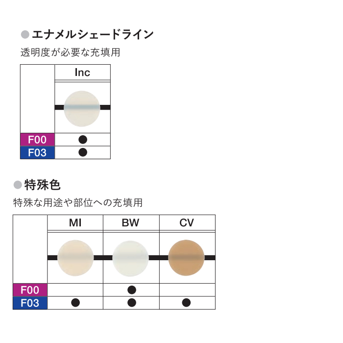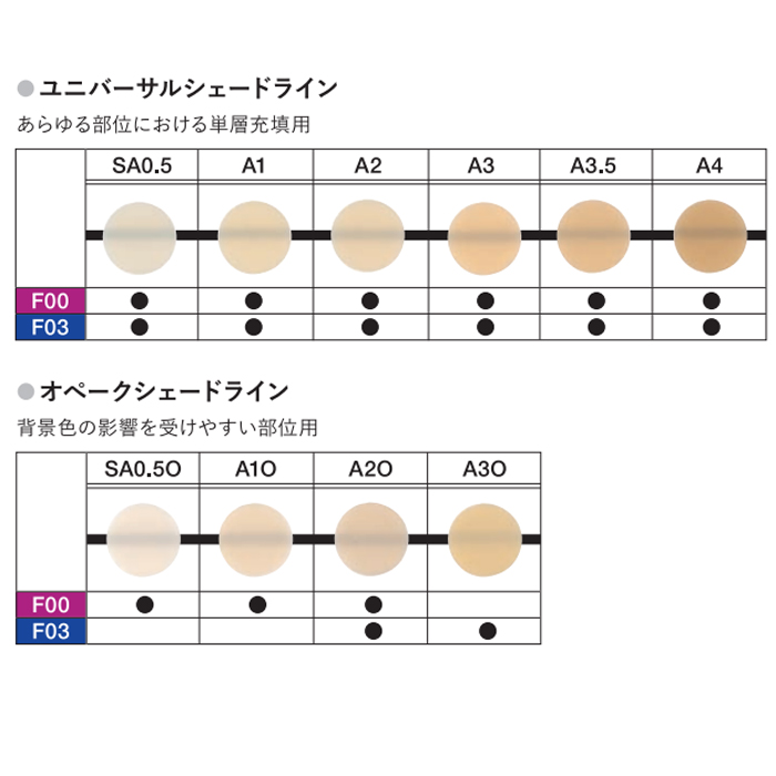 | 備考 | <色調> ○F00超低流動タイプ(11色)SA0.5、A1、A2、A3、A3.5、A4、SA0.5O(オペーク)、A1O(オペーク)、A2O(オペーク)、Inc(インサイザル)、BW(ブリーチングホワイト)、D-DP(ジンジバ色)、G-LP(ジンジバ色)、G-Br(ジンジバ色) ○F03低流動タイプ(12色)SA0.5、A1、A2、A3、A3.5、A4、A2O(オペーク)、A3O(オペーク)、Inc(インサイザル)、MI(ミルキー)、 BW(ブリーチングホワイト)、CV(サービカル) |