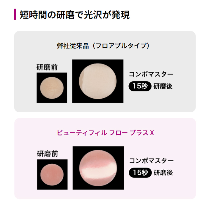 従来品「ビューティフィル フロー プラス」でご好評いただいている「築盛と充填に適した2種類の流動性」「切れが良く、レベリング性にすぐれたペースト性状」を継承しつつ、「すぐれた研磨性」「摩耗後における艶の発現」を実現させたインジェクタブルハイブリッドレジンです。