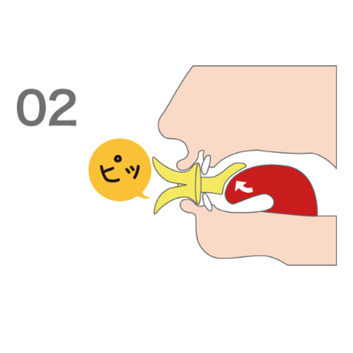 唇の裏と歯の表側に挟み、繰り返し唇を 「ギュー」と閉じて押しつぶす運動です。