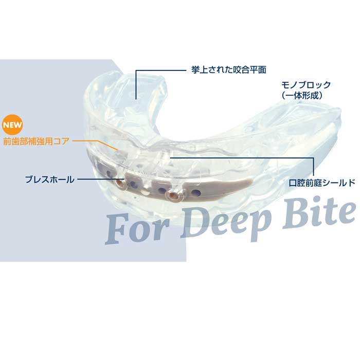 『Multi-DB は PEEK 樹脂製の補強用コア』が前歯部に組み込まれており、前歯部への過度な噛み込みが懸念されるディープバイト症例の患者さんでも噛みちぎりによる装置の破損を防ぐことに寄与します。