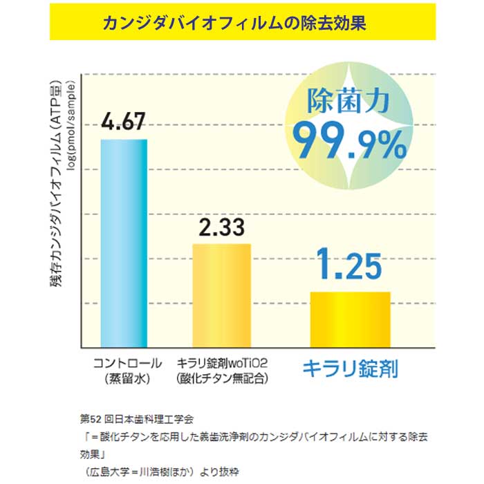 キラリ錠剤は酸素系漂白剤の効果でヤニや茶渋などの着色汚れ、バイオフィルムによるヌメリや臭い、さらに二酸化チタンの効果でカンジダ菌を除菌・洗浄します。