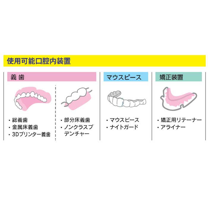 口腔内装置を痛めにくい中性タイプとなっているため、金属床義歯やチタン・パラジウム合金・矯正用リテーナーにも安心してお使いいただけます。