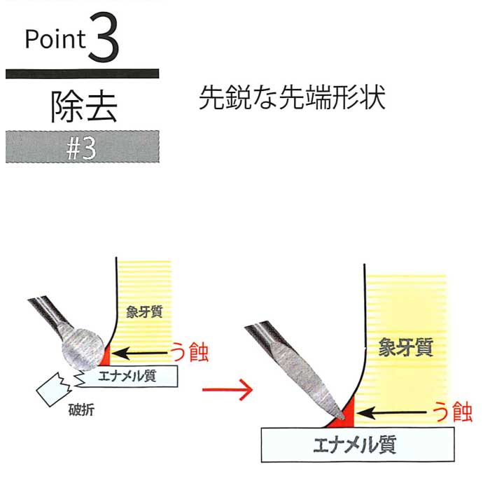エナメル-象牙境に残るう蝕象牙質も、エナメル質を破折することなく除去できます。