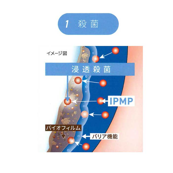 殺菌成分IPMPが⻭周病原細菌を含むバイオフィルムの内部に浸透して殺菌し、⻭⾁炎を予防します。