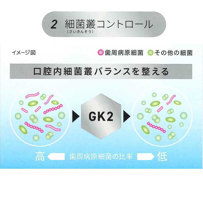 薬⽤成分GK2が⼝腔内細菌叢(⼝内フローラ)のバランスを⻭周病原細菌の比率が低い状態に整えて⻭⾁の炎症を抑え、⻭⾁炎・⻭周炎を予防します。