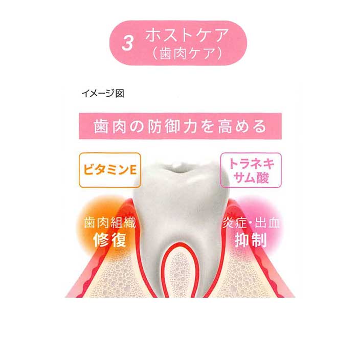 薬⽤成分ビタミンEが⻭⾁組織を修復し、トラネキサム酸が⻭⾁の炎症・出⾎を抑え、⻭⾁炎・⻭周炎を予防します。