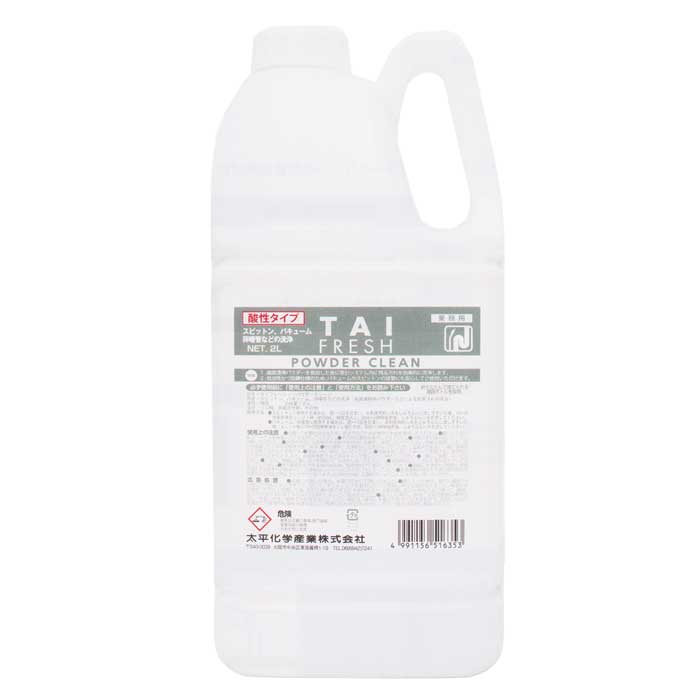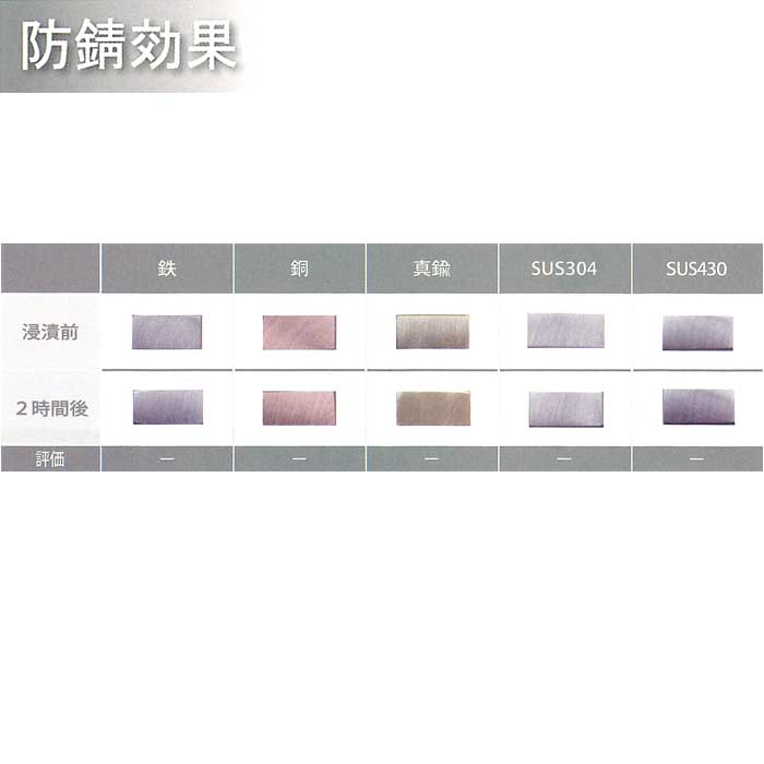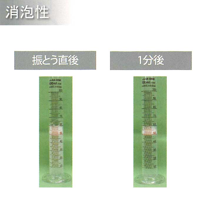製品詳細 《タイフレッシュ・パウダークリーンの泡立ち試験》 10倍希釈液50mLを室温にて1分間激しく振とうさせた後、泡立ちの経時変化を観察した。 《タイフレッシュ・パウダークリーンの防錆効果試験》 試験片を10倍希釈した試験液に全浸漬し、室温で2時間後の影響を以下の基準で評価した。 【試験片:表面変化、液:溶出の有無等】 《評価》 -:全く変化なし ±:ごく僅かな変化 +:明らかな変化 (明らかな変色、部分的な浸食) ++:顕著な腐食 タイフレッシュ・パウダークリーン10倍希釈液 液200mLに歯面清掃パウダー(炭酸カルシウム)を1.0g投入し、投入直後および30分後の液の様子を目視で観察した。