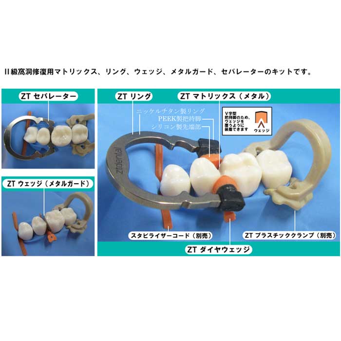 | 備考 | 【キット内容】 ・ZT マトリックス メタル 4.5mm 20枚 ・ZT マトリックス メタル 5.5mm 20枚 ・ZT マトリックス メタル 6.5mm 20枚 ・ZT ウェッジ メタルガード Sグリーン 5個 ・ZT ウェッジ メタルガード Mオレンジ 5個 ・ZT ウェッジ メタルガード Lパープル 5個 ・ZT セパレーター 1個 ・ZT リング 大臼歯用 1個 ・ZT リング 小臼歯用 1個 ・ZT ダイヤウェッジ ES イエロー 16個 ・ZT ダイヤウェッジ S ブルー 16個 ・ZT ダイヤウェッジ M オレンジ 16個 ・ZT ダイヤウェッジ L グリーン 16個 ・ZT ダイヤウェッジ ディープ パープル 16個 |