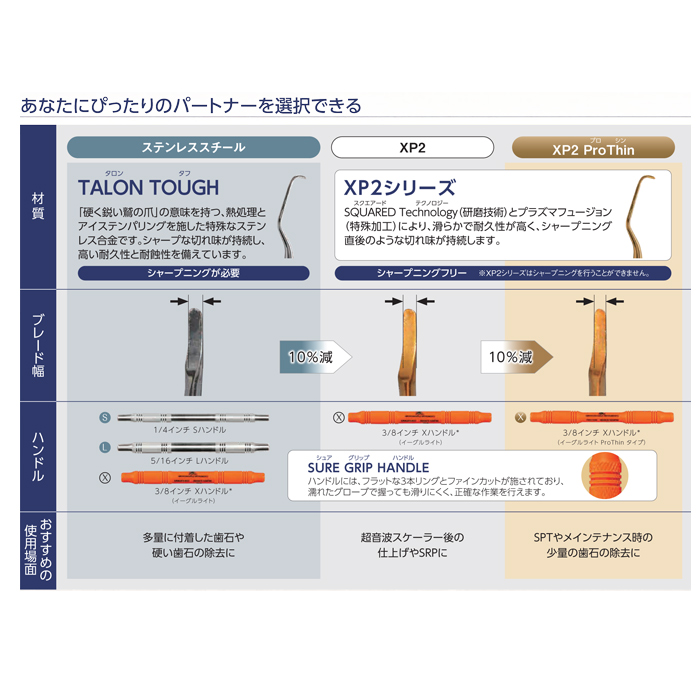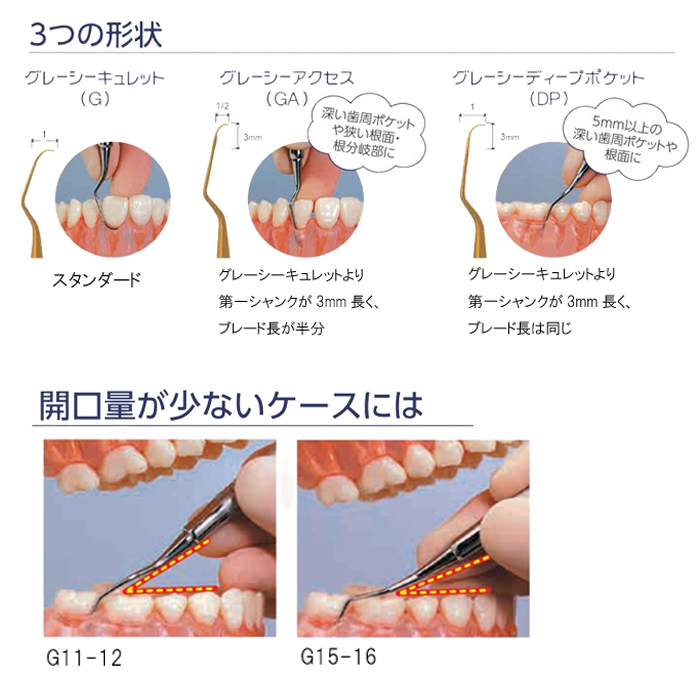 製品詳細 シャープニングフリーで、正しいブレード形状を維持できるため、変形によるリスクを最小限に抑えられます。 刃部の仕上がりが滑らかで刃こぼれしにくく、余分な側方圧をかけずに操作でき、術者の手指への負担と患者さんへの不快感を軽減します。 用途に合わせて3つの形状が用意されています。 開口量が少ないケースには、臼歯部でも操作のしやすいG15-16、G17-18をラインナップしています。