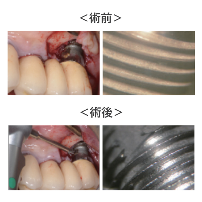 インプラント本来の形状 (スレッド) を残しつつ表面の汚染物質を除去することで、 インプラント周囲炎の再発を予防します。