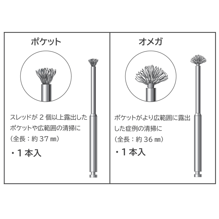 ニッケルチタン製の NiTi ブラシはインプラント表面のスレッド形状を維持したまま研磨することが可能です。