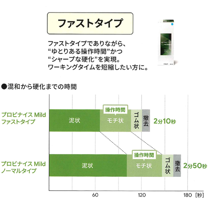 粉は、混和からの硬化時間が異なるファストタイプ・ノーマルタイプの2種類をラインナップ。