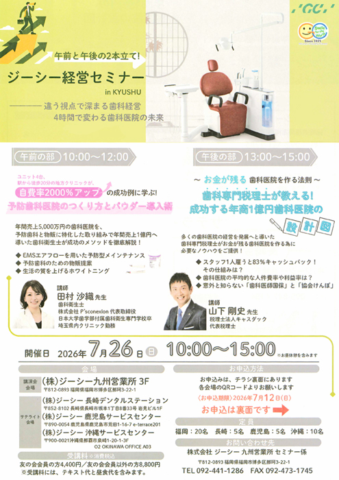 | 講師 | 午前の部 田村 沙織 先生 ・歯科衛生士 ・株式会社 P'sconexion 代表取締役 ・日本大学歯学部付属歯科衛生専門学校卒 ・埼玉県内クリニック勤務 午後の部 山下 剛史 先生 ・税理士法人キャスダック 代表税理士 |